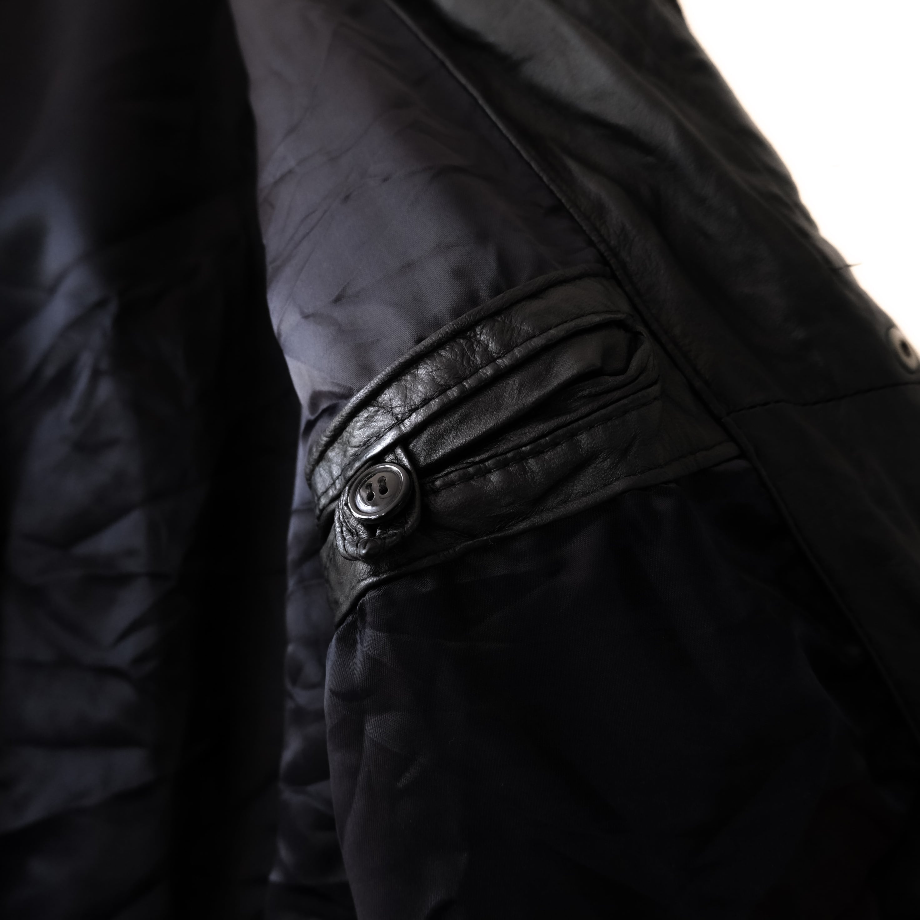 レザーの切替や片側ジッパーを施したディテール等