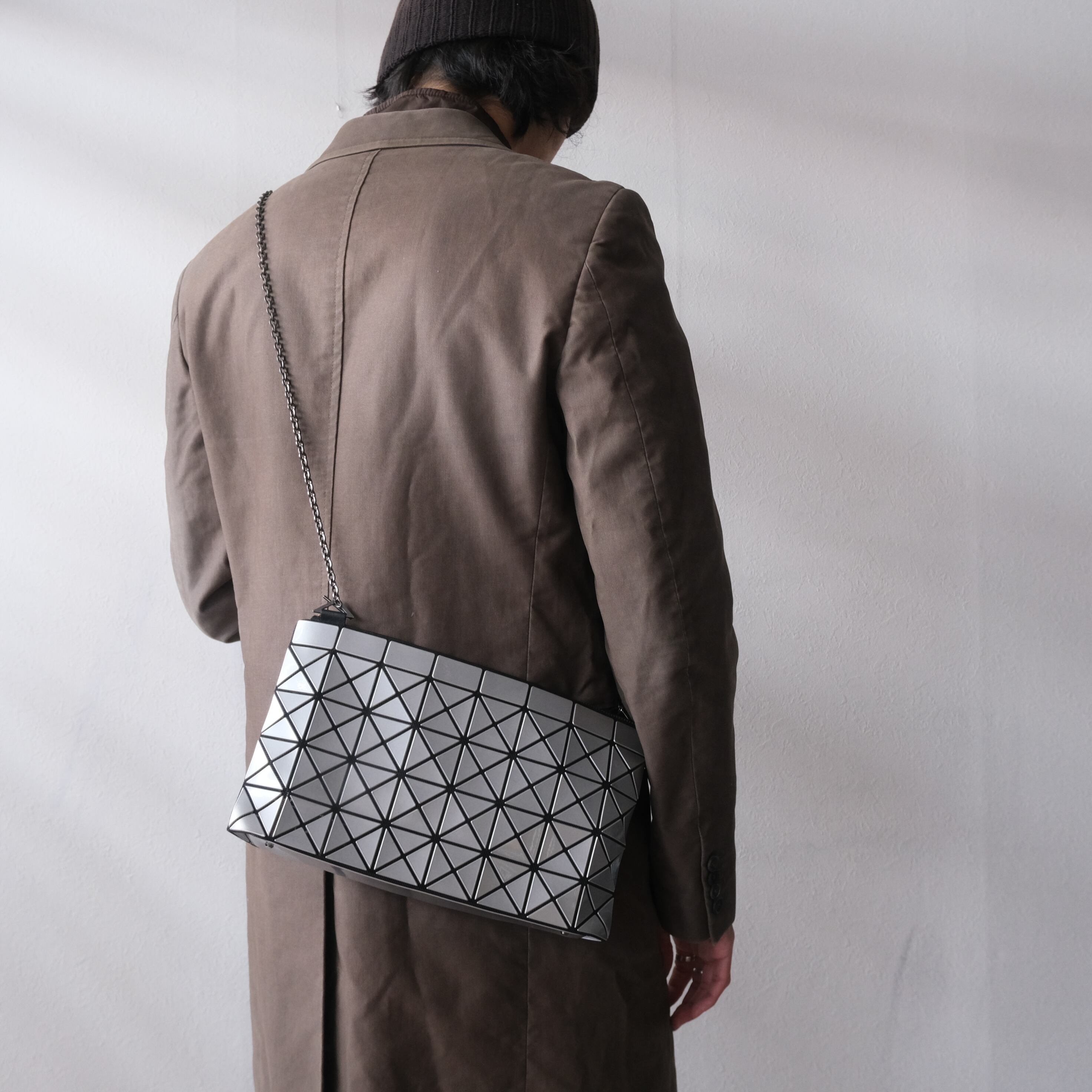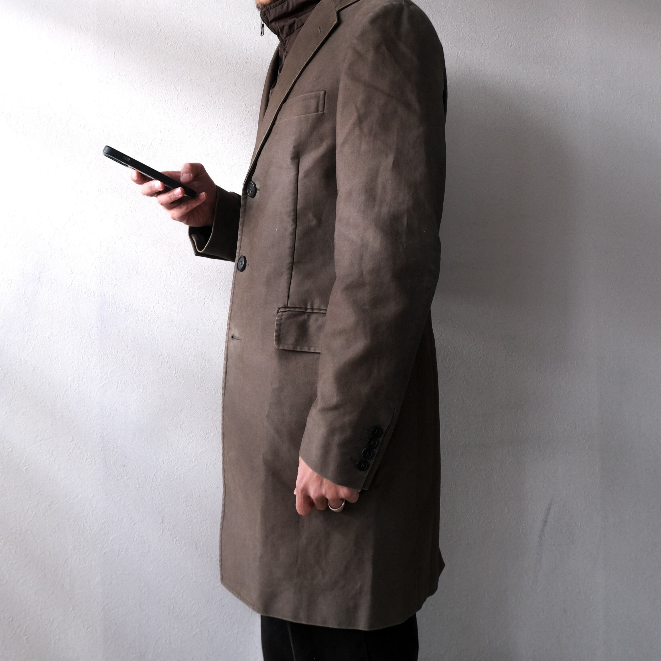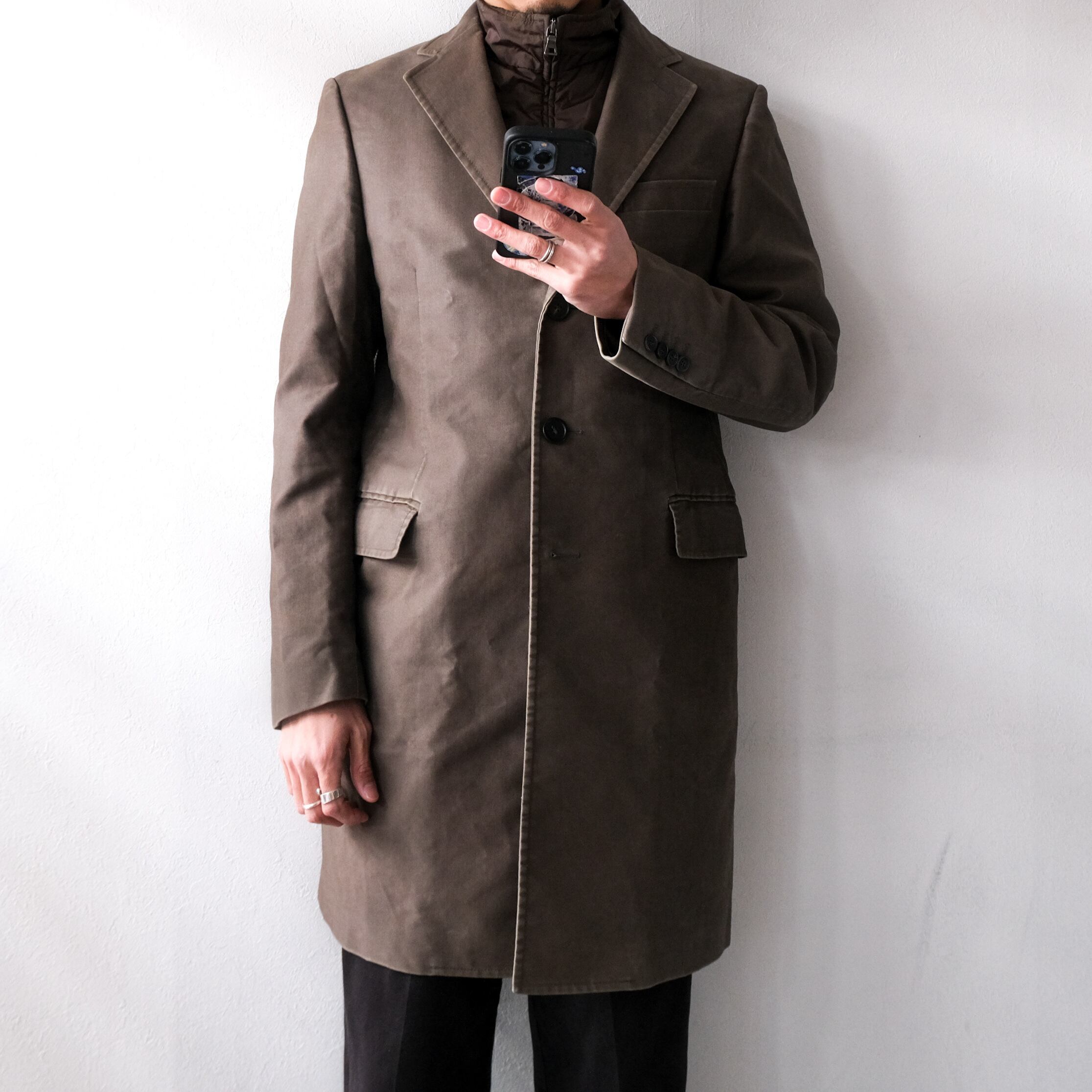 ブラウンの艶やかなコートのドッキング。